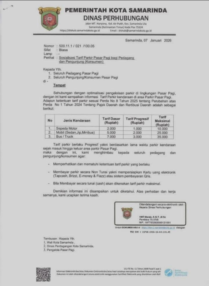 KALTIMWARA.COM - SAMARINDA - Pemerintah Kota Samarinda melalui Dinas Perhubungan (Dishub) resmi mengumumkan penyesuaian tarif parkir di kawasan Pasar Pagi. Langkah ini diambil sebagai bagian dari optimalisasi pengelolaan perkir berdasarkan Peraturan Daerah (Perda) No. 8 Tahun 2025 yang merupakan perubahan atas Perda No. 1 Tahun 2024 tentang Pajak Daerah dan Retribusi Daerah.