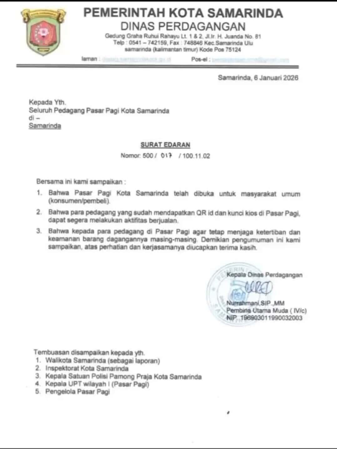 KALTIMWARA.COM - SAMARINDA - Angin segar berhembus bagi roda perekonomian di Kota Tepian. Mulai hari ini, Selasa, 6 Januari 2026, Pemerintah Kota Samarinda melalui Dinas Perdagangan secara resmi mengumumkan pembukaan kembali operasional Pasar Pagi untuk masyarakat umum. Kebijakan ini menandai dimulainya babak baru aktivitas jual-beli di salah satu pusat perbelanjaan ikonik kota tersebut.